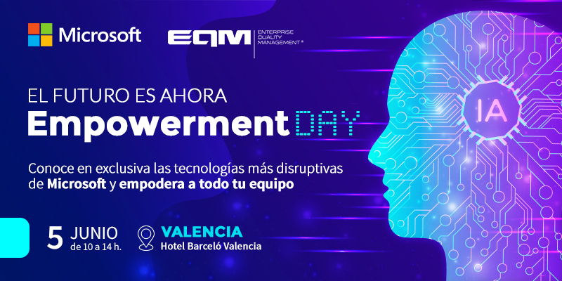 Próxima Jornada Profesional, Microsoft Empowerment Day Valencia Desde EQM y Microsoft, te invitamos a la Jornada Profesional Empowerment Day, que celebraremos en Valencia el próximo 5 de junio. Empowerment Day es el evento de gestión empresarial y productividad que marcará un antes y un después en tu empresa y en el que conocerás exclusiva las […]