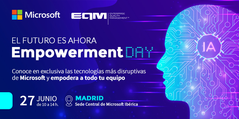 Próxima Jornada Profesional, Microsoft Empowerment Day Madrid Desde EQM y Microsoft, te invitamos a la Jornada Profesional Empowerment Day, que celebraremos en Madrid el próximo 27 de junio. Empowerment Day es el evento de gestión empresarial y productividad que marcará un antes y un después en tu empresa y en el que conocerás exclusiva las […]