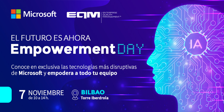 Desde Microsoft y EQM, partner experto en la implantación y optimización de soluciones de negocio de Microsoft, te invitamos a la Jornada Empresarial Microsoft Empowerment Day Bilbao, donde podrás conocer cómo abordar la transformación digital de tu empresa con las herramientas más avanzadas.