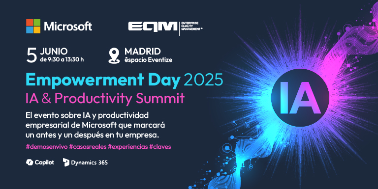 Desde Microsoft y EQM, partner experto en la implantación y optimización de soluciones de negocio de Microsoft, te invitamos a la Jornada Empresarial Empowerment Day 2025: IA & Productivity Summit, el evento sobre inteligencia artificial y productividad empresarial de Microsoft que marcará un antes y un después en tu empresa.