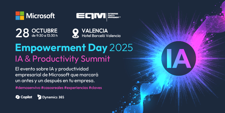 Desde Microsoft y EQM, partner experto en la implantación y optimización de soluciones de negocio de Microsoft, te invitamos a la Jornada Empresarial Empowerment Day 2025: IA & Productivity Summit, el evento sobre inteligencia artificial y productividad empresarial de Microsoft que marcará un antes y un después en tu empresa.