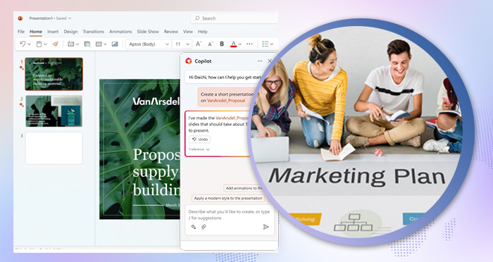 - Crea presentaciones impactantes: Deja a Copilot ayudarte a crear una presentación atractiva mediante la generación de diapositivas o imágenes.